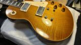 レスポールでゴールドというと、ゴールドトップを思い浮かべますが、50年代にレアなオールゴールドが存在しました。ゴールドを表現するには、ブラスパウダーといい酸化して錆びる金粉を使います。ヴィンテージ・ゴールドでよく見るクリアー塗装が欠けた部分が、緑色に見えるのがブラスの錆びたところです。国産ギターのゴールドメタリックは、シルバーメタリックをイエローに色付けしているので、それらとはブラスパウダーの色の表現力が違います。しかし、このブラスパウダーはクリアーに混ぜてスプレーガンで吹くのですが、吹いた後は塗装ブース周りに金の粉が舞ってしまい掃除が大変で、何日間はこの金の粉に悩まされます。