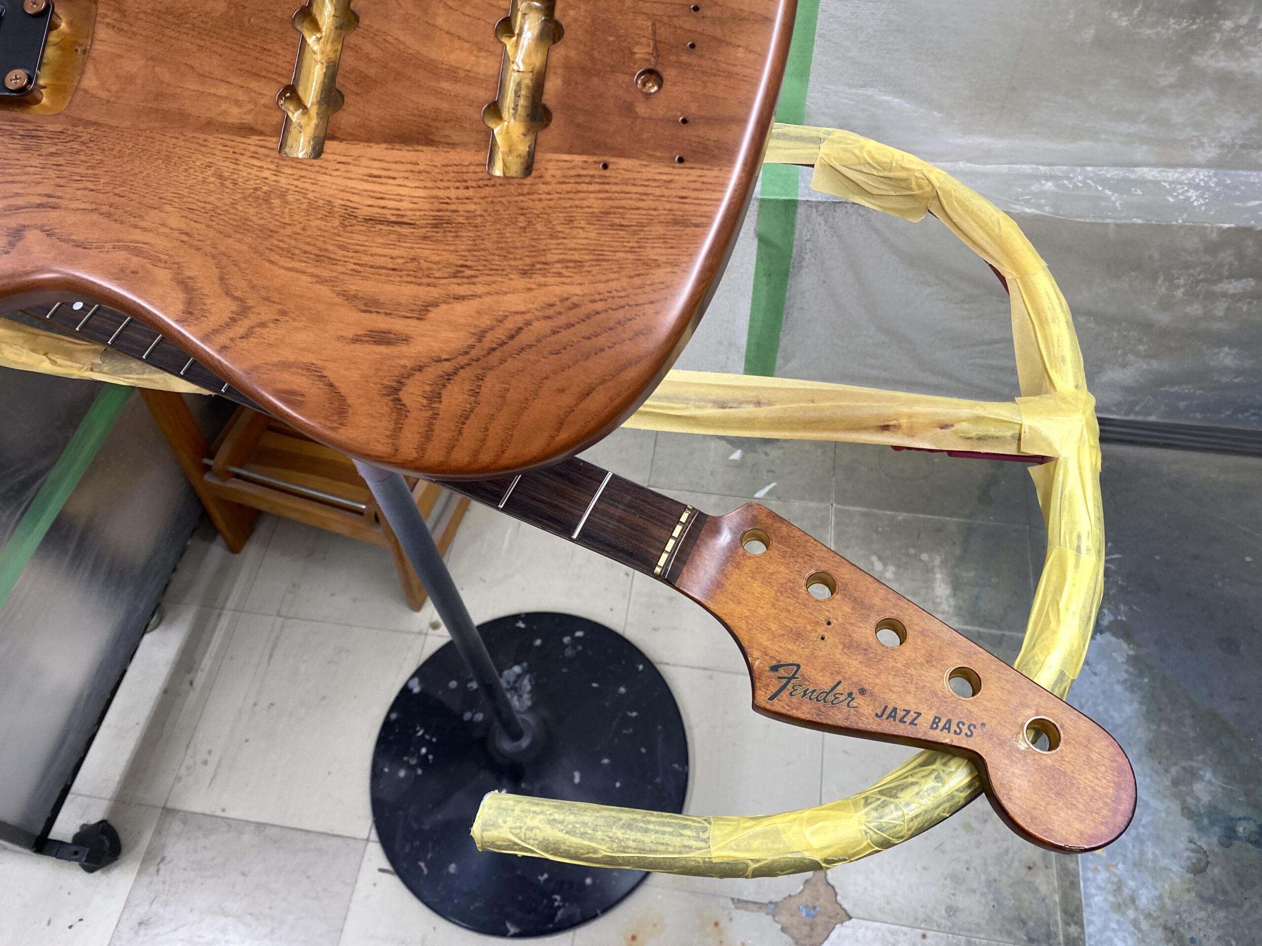 これでネックとのマッチングカラーになりました。あとは、ネックが艶のないサテンフィニッシュなので、ボディもこれに合わせ100%艶消しフラットを塗り乾燥させます。