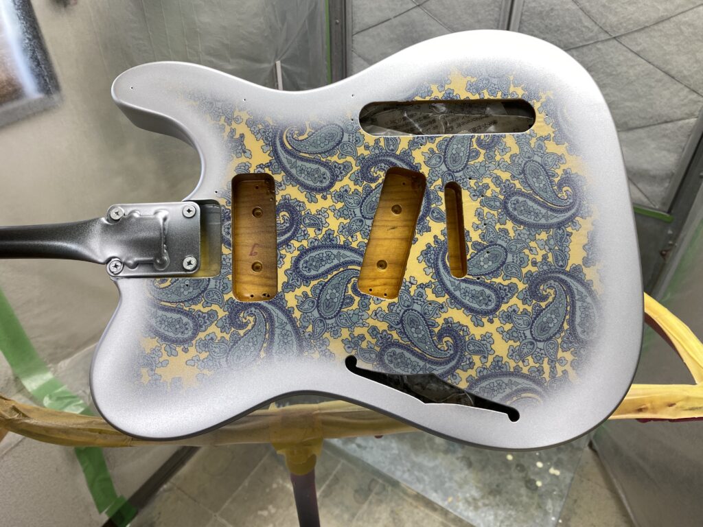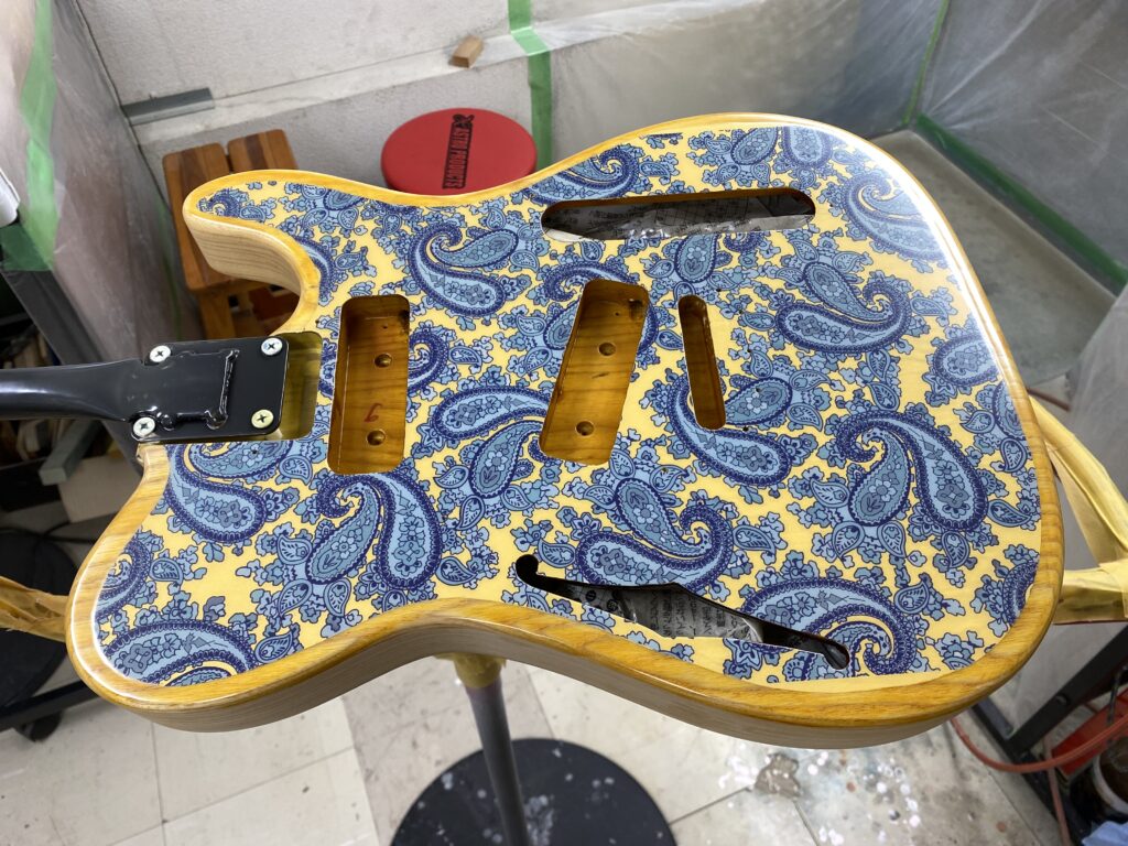 Fenderから1968年より生産されたペイズリー柄のテレキャスターがありますが、このペイズリー柄はペイントで描いているわけではなく、ペイズリー柄の壁紙をギターボディーのトップとバックに貼り、周りをわからないようにボカシを入れサンバーストに塗装されています。今回はこのやり方で、G&LのASAT Thinelineをペイズリー柄に変身させます。