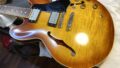 まずは、ボディの塗装を剥がします。このギターは元々サンバーストでしたので、木自体にイエローが染みていますが、トップとバックは壁紙を貼るのでイエローが残っていても問題ありません。