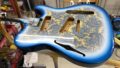 まずは、パーツを全て外して指板にマスキングをして塗装を剥がして行きます。このようなホローボディーの場合ヒートガンで熱を加えるとラミネートで接着しているボディが剥がれる可能性があるので、サンディングで剥がします。