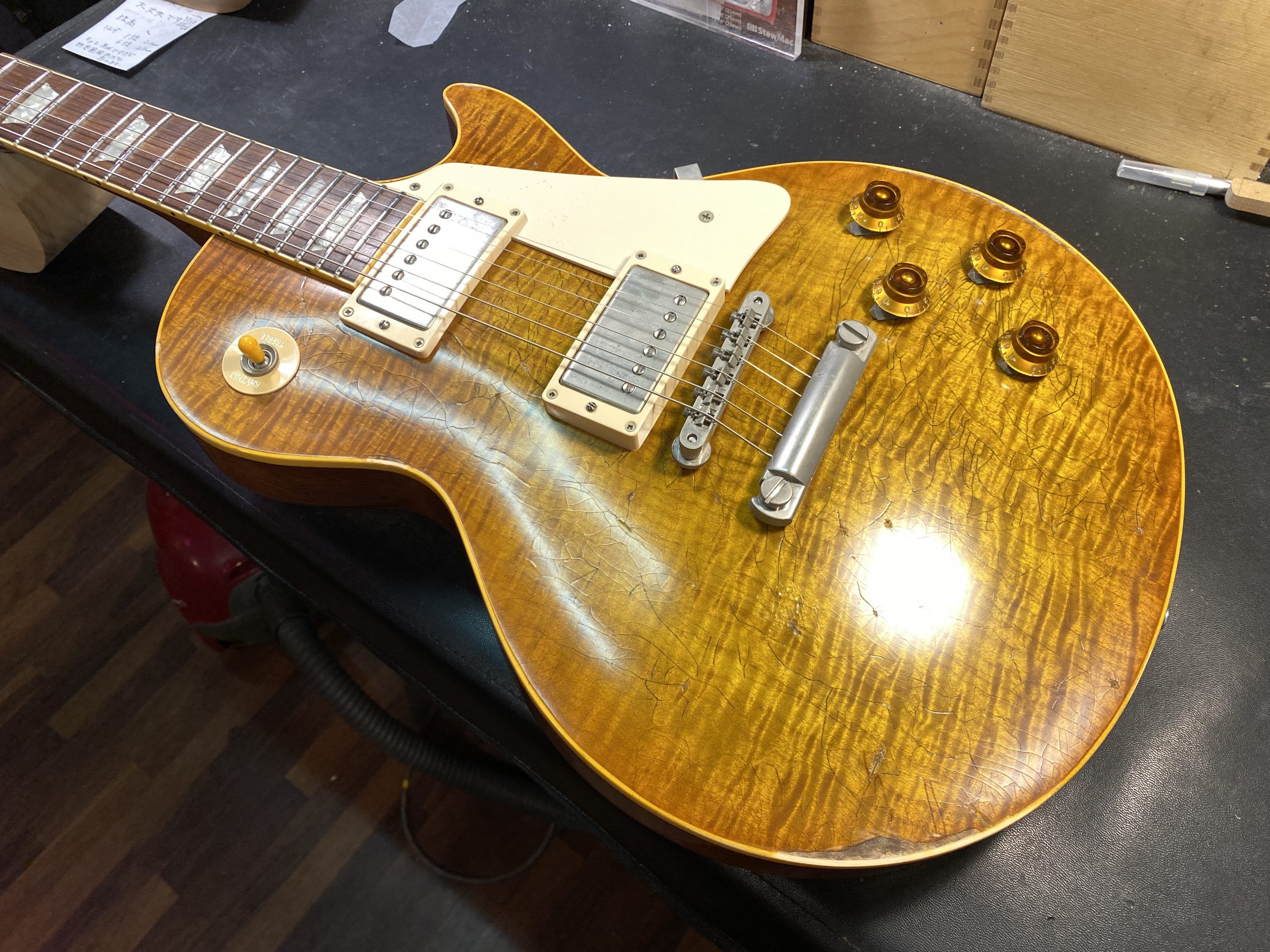 最近では、今のフィニッシュが綺麗すぎるからヴィンテージ感のある使い込まれた雰囲気にしたい方も増えていて、このような雰囲気にするのにはヴィンテージ風にするという前提で元塗装を剥がし最初からヴィンテージカラーにエイジド加工のことも考えながら塗装して行きます。