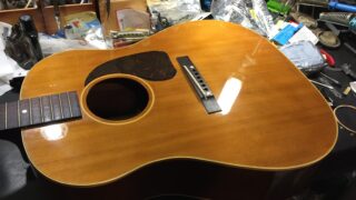 ギター修理 40年代のGibson J-45ブリッジをオリジナルサイズに+トップリフィニッシュ お客さんが他店で、以前にブリッジを交換した際に、新しいブリッジのサイズが少しオーバーサイズに交換されていて、それからずっと気にしていたみたいです。このギターは以前オリジナルブリッジが割れた為、新しいブリッジに交換されたみたいです。オリジナル... 2020.02.02 ギター修理塗装